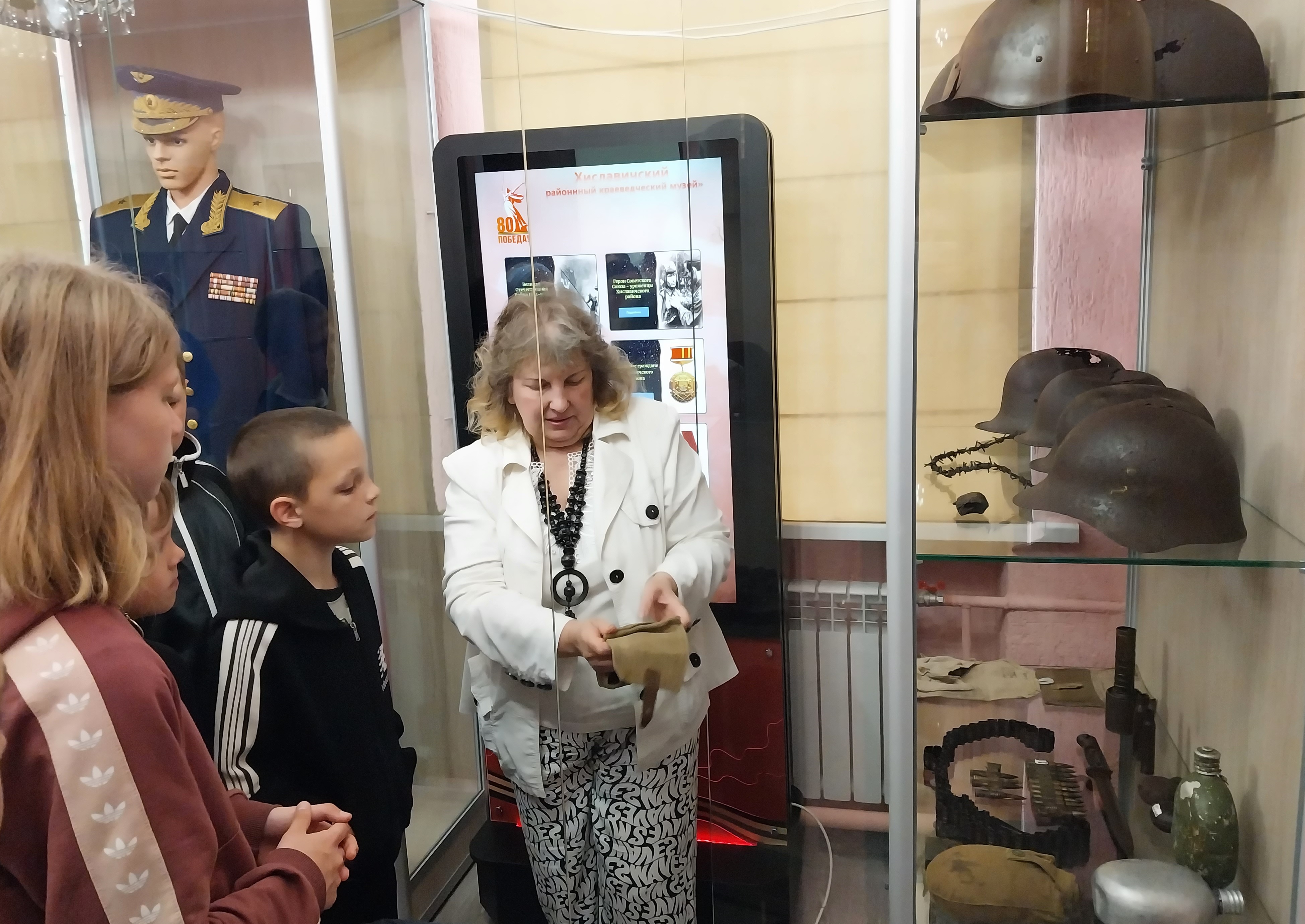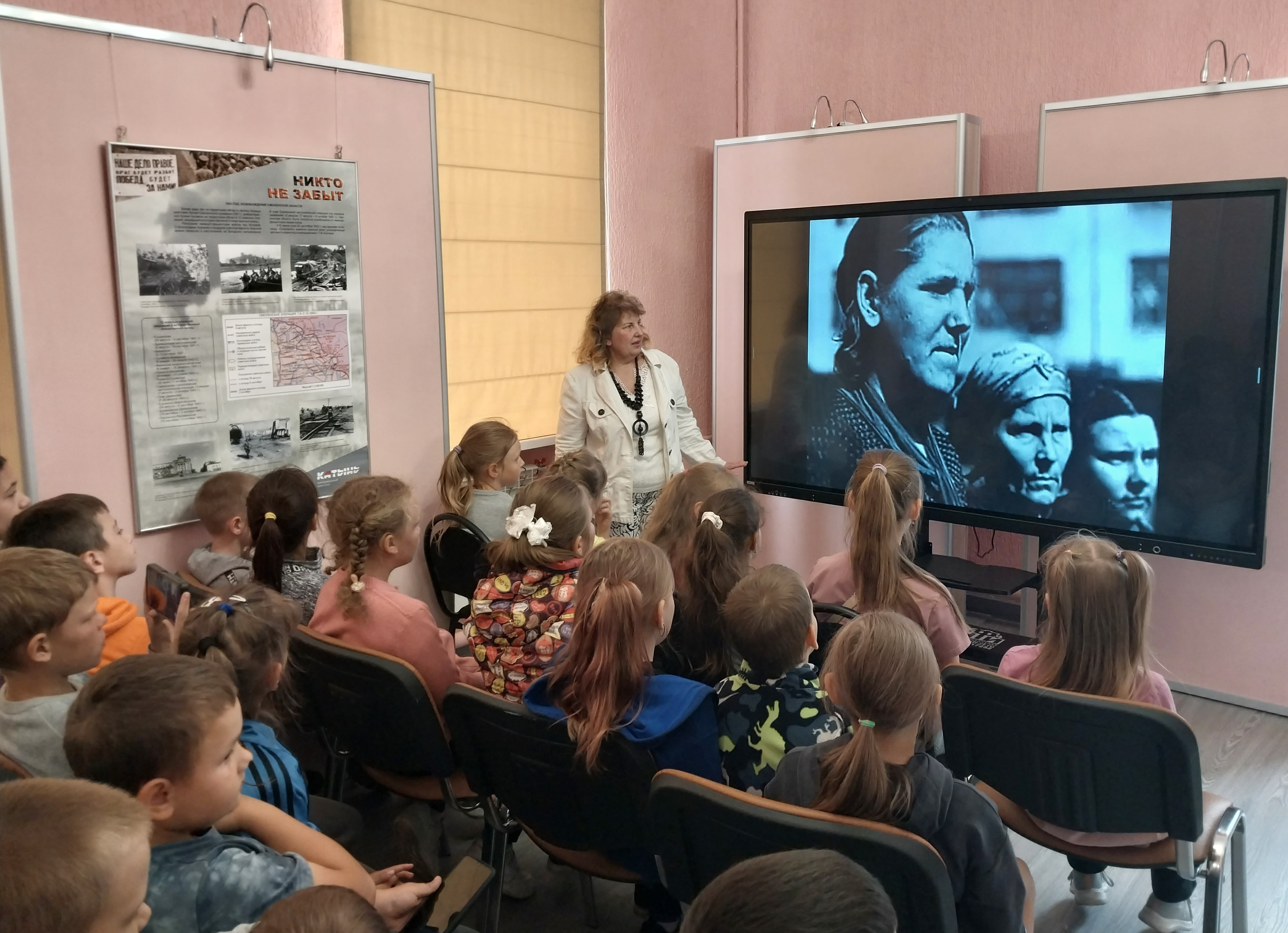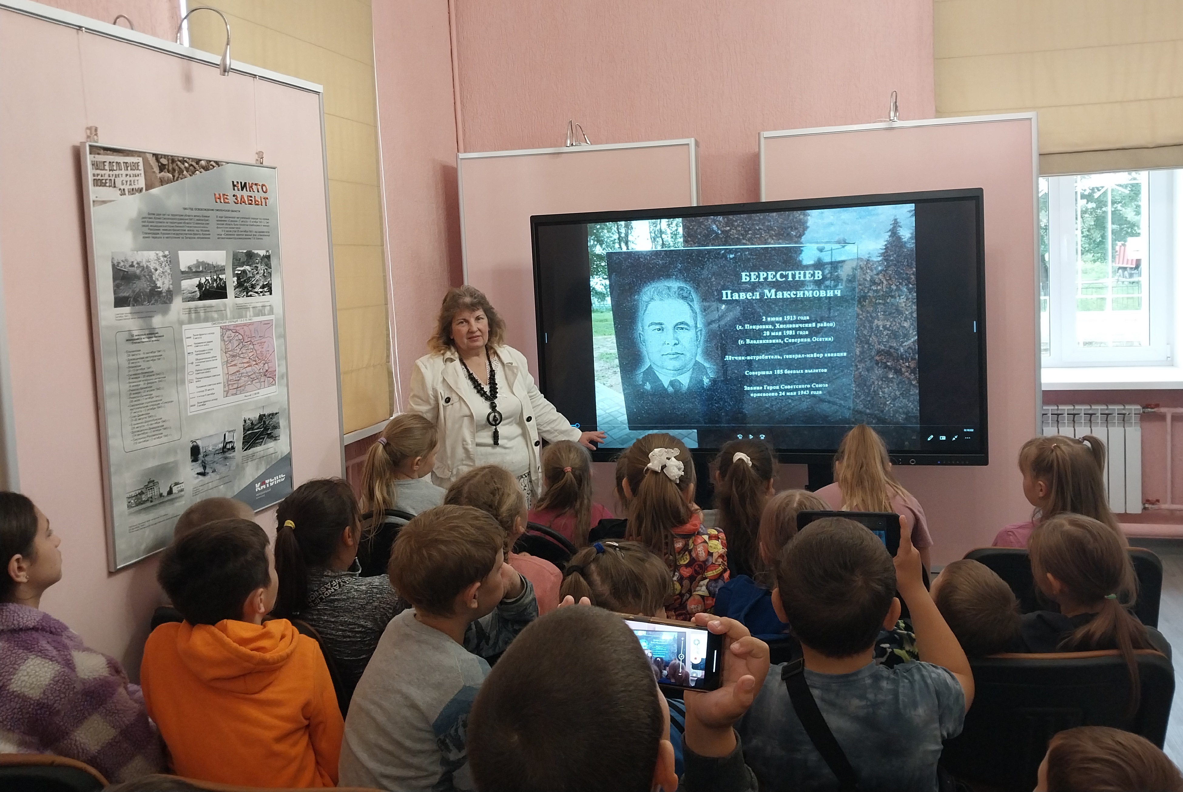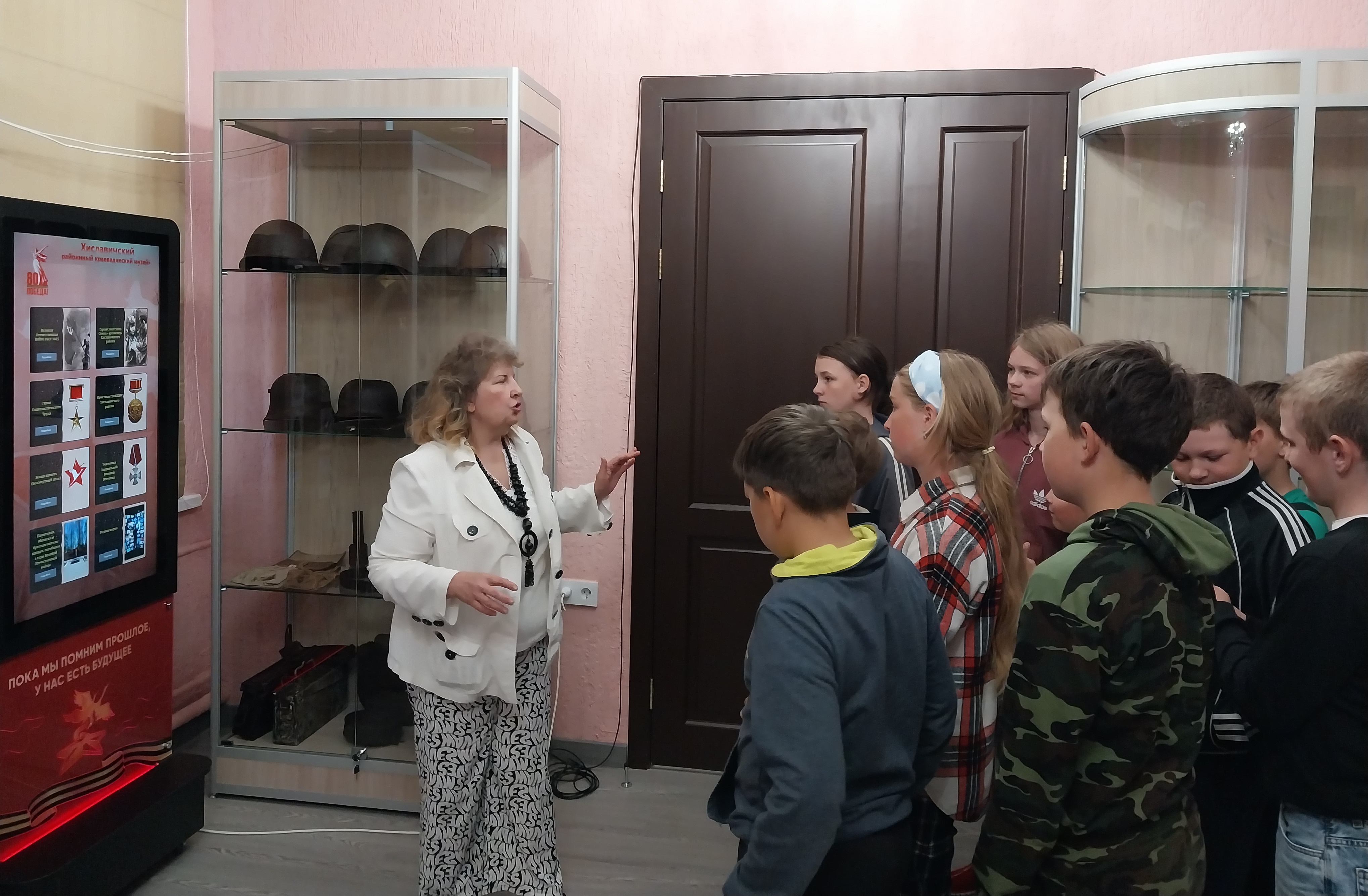 Документальные кадры перенесли ребят  в далекий 1941 год - первый день начала Великой Отечественной войны. В зале "Хиславичский район в годы Великой Отечественной войны" ребята узнали о страшных днях оккупации нашего района, героях – подпольщиках и Героях Советского Союза.  В тяжелой кровопролитной войне советский народ внес решающий вклад в освобождение народов Европы от фашистского господства и в разгром гитлеровских войск.